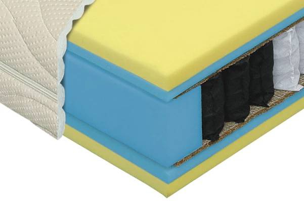Vrchni a spodní desky : Viscoelastická – líná pěna o hustotě 50 kg/m³ a studená (HR) pěna o hustotě 38 kg/m³.